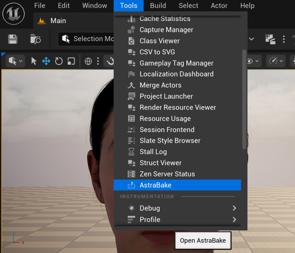- In the Editor go to the main “Tools” Menu and search for Astrabake to launch the UI